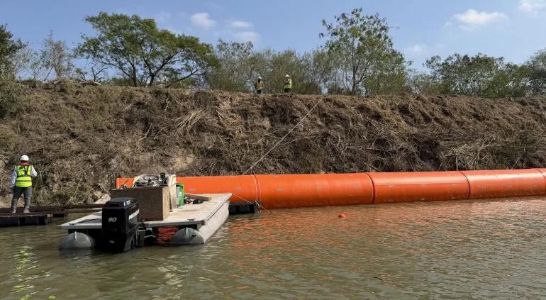 Al final, pretenden colocar 862 kilómetros de barrera con grandes cilindros naranjas y flotantes dentro del río.